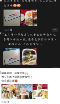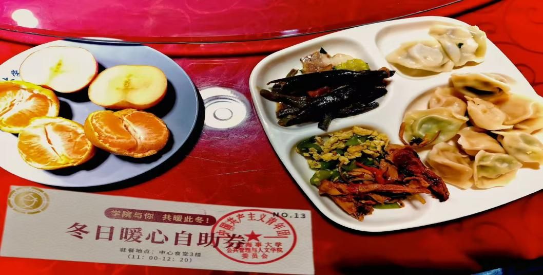 当天中午,中心食堂三楼教职工餐厅内暖意融融,香气四溢。拿到兑换券的同学们陆续来到餐厅,有序排队打餐。饺子馅料丰富多样,兼顾不同口味需求,一个个饱满的饺子在餐盘里冒着热气,咬上一口,鲜美的滋味在舌尖散开,更在心底化作阵阵暖流。