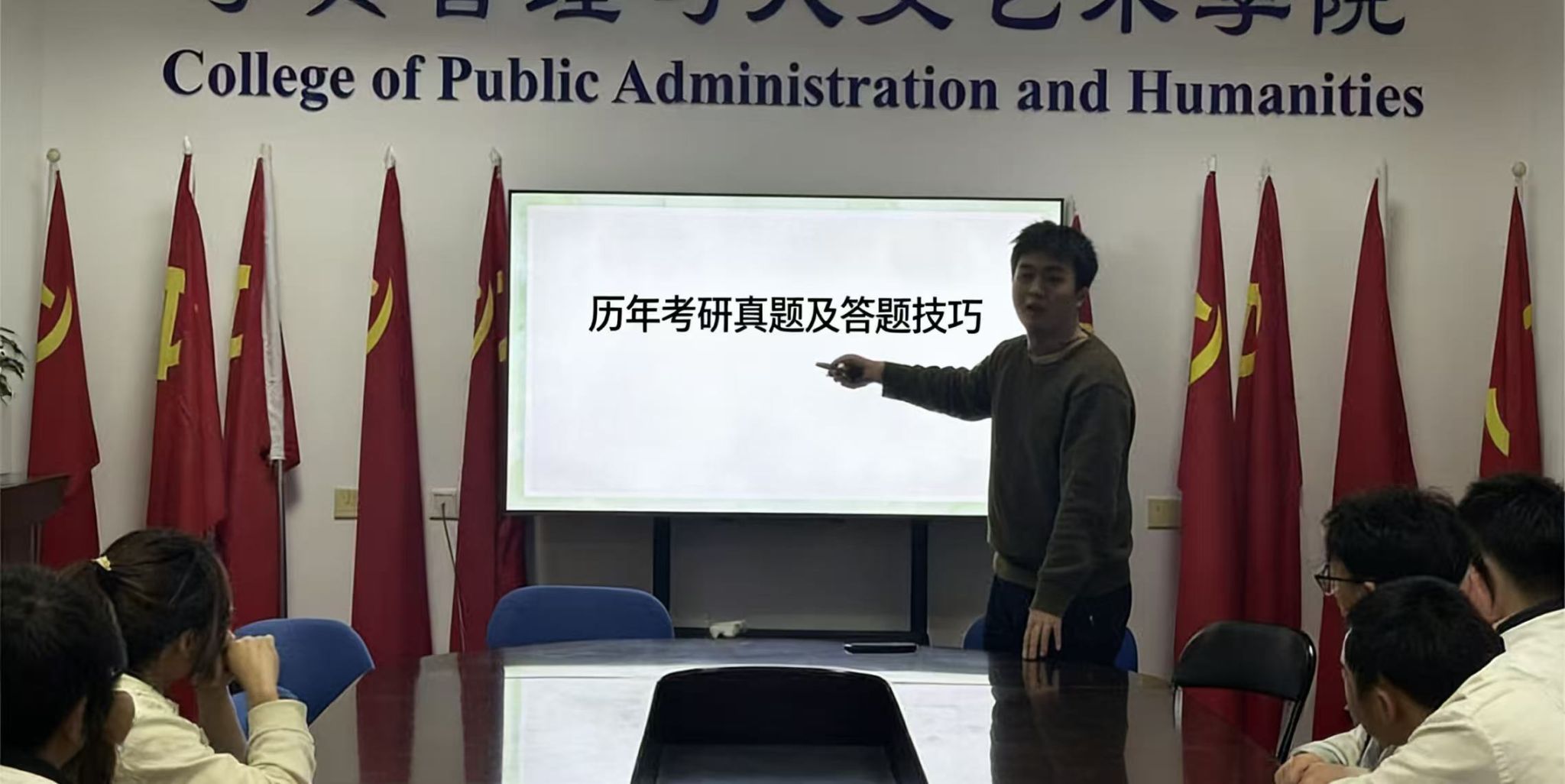 会上,结合近年考研形势,从院校选择、专业匹配、复习规划等维度进行系统讲解,重点剖析了公共课复习的时间节点与提分技巧,针对专业课备考的重难点进行靶向拆解;他结合自身备考经历,分享了备考心态调节、资料筛选、复试准备等实战经验,还就同学们提出的“跨专业备考如何平衡时间”“冲刺阶段如何查漏补缺”等问题进行一对一答疑。