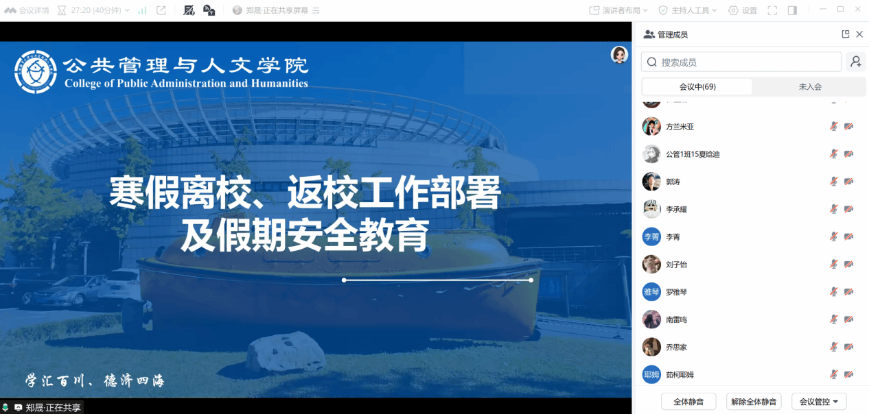 研究生中队指导员吴穷、张诗淇结合研究生假期科研实践、外出调研、学术交流等实际情况,着重强调人身安全问题,包括外出调研安全防护及居家用电用火安全规范,督促研究生群体强化责任意识,严守安全底线。