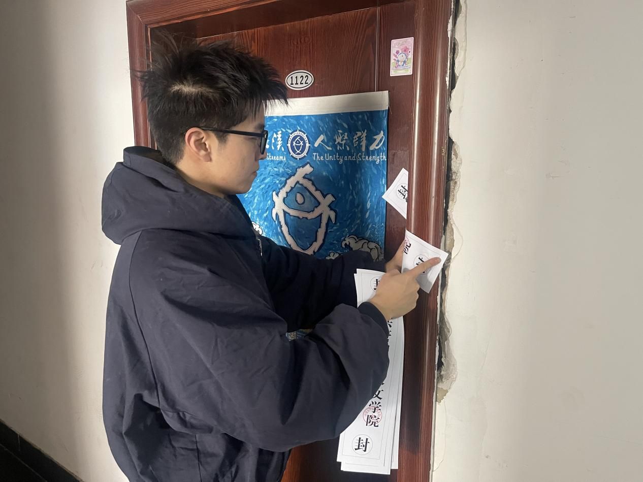 学生集中离校后,全体学生工作干部深入学生宿舍对寝室门窗、电源、消防安全等情况进行安全检查,确认宿舍学生全员离校并做好安全检查后,对宿舍张贴封条。