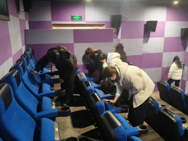 在湖畔书屋电影院,同学们主动开展卫生清洁行动。大家手持清洁工具,对座椅缝隙、地面角落等易积灰区域进行重点清理,仔细擦拭扶手、捡拾杂物,不放过任何一处卫生死角。细致的清扫与整理,不仅让影院环境更加干净温馨,也彰显了人文学子践行志愿精神、守护校园美好空间的青春担当,为每一位观影人营造了舒适惬意的体验,让雷锋精神在细微之处熠熠生辉。
