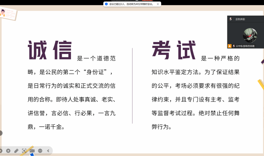 考试工作管理规定》等文件,2024中队指导员吕京泽结合学校违纪处分的相关案例,阐明了违纪行为产生的严重后果,引导学生切勿触碰红线,宣讲诚实守信事迹,培养学生诚信意识。