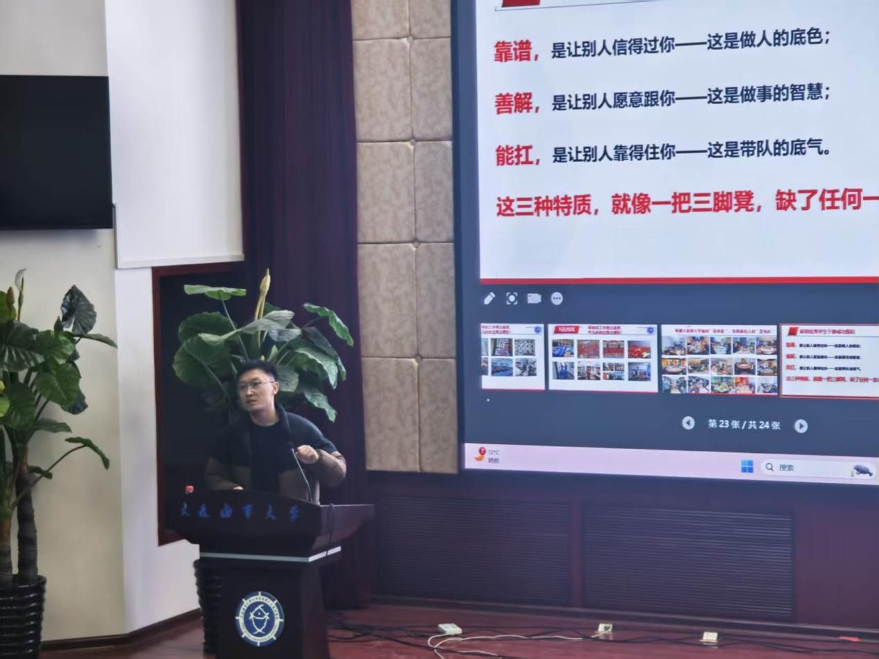 船舶与海洋工程av视频指导员薛航,以 《守初心 担使命 善作为——解锁优秀学生干部的成长密码》为主题作讲座。他结合工作经验,从 “初心使命”“责任担当”“方式方法” 三个维度切入,用大量生动的案例,为同学们解锁了如何成为一名优秀学生干部的“通关密码”:学生干部不仅是一种身份,更是一种责任,要时刻守住为同学服务的初心,在关键时刻站得出来、顶得上去,更要善于思考、讲究方法,在成就他人的同时实现自我价值的提升。
